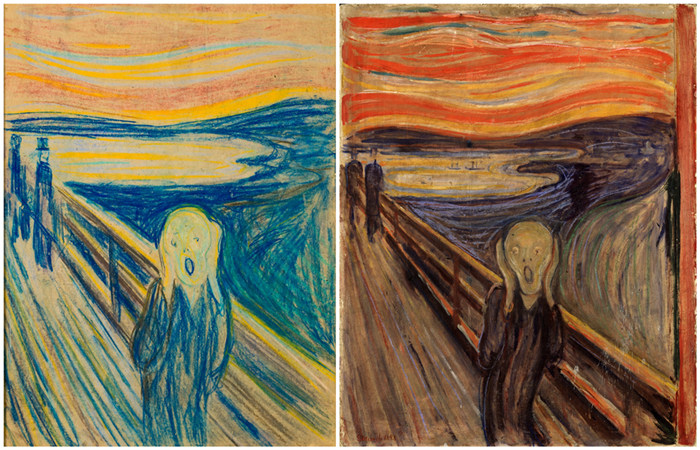 《吶喊》,蒙克,奧斯陸蒙克美術館藏品,左圖*:1893年粉彩版,粉蠟筆草稿;右圖*:1893年蛋彩版(最著名版本)
