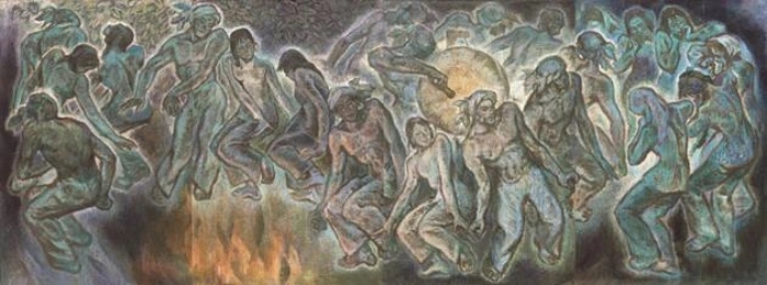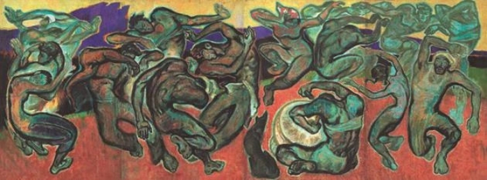 生命的歸宿和起點之舞——跳喪·擺手 唐小禾、程犁油畫 185×500cm×2 1983年 湖北美術館藏