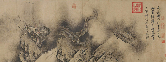 陳容是南宋時期的著名畫家,《圖繪寶鑒》記載其人:“善畫龍,得變化之意。潑墨成云,噀水成霧。醉余大叫,脫巾濡墨,信手涂抹,然后以筆成之?;蛉w,或一臂一首,隱約而不可名狀者,曾不經意而得,皆神妙寶祐間名重一時,垂老筆力簡易精妙,絳色者可并董羽,往往贗本亦托以傳”。陳容創作過多幅關于龍的佳作,有《墨龍圖卷》《十龍圖卷》《五龍圖卷》《龍云飛霧圖》《九龍圖卷》等。