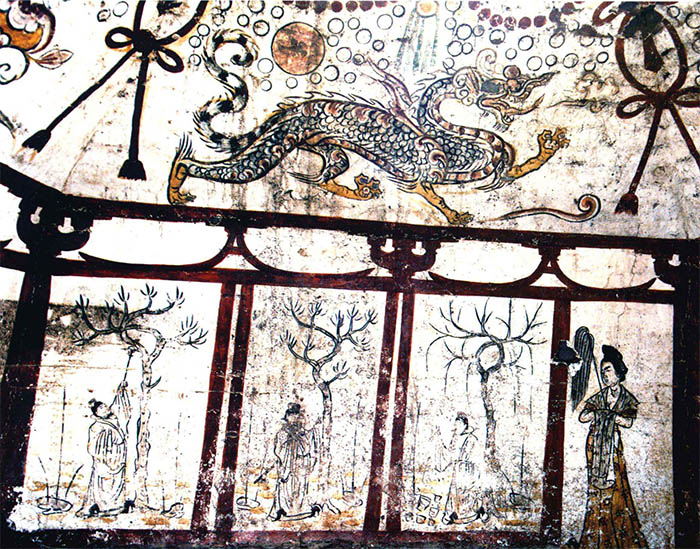 這幅《青龍人物圖》壁畫出土于太原市焦化廠唐代墓葬中,位于墓室東壁。一條騰飛的青龍占據了畫面的一半,旁有紅日、星象、寶相花、流云。