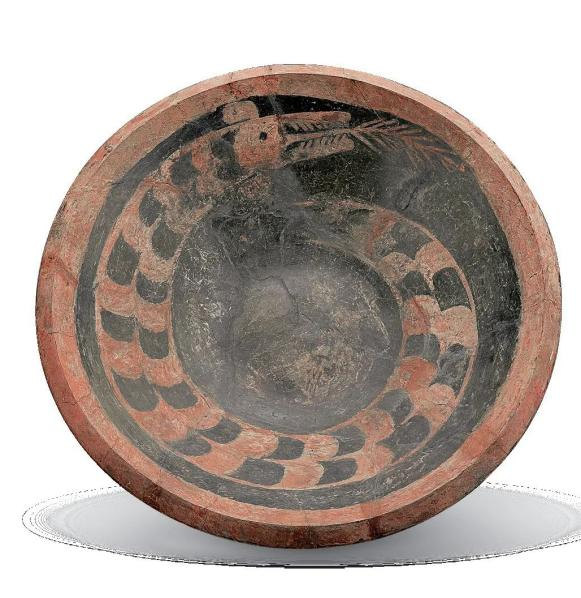 這條龍繪制在陶盤內壁上,在其上以紅、白兩色裝飾鱗紋。細看這條龍,長嘴內露出尖銳的牙齒,長信外吐有如麥穗。身向內卷,尾部在盤底中心。史前時期的龍形象體現了古人高超的手工業水平和想象力,此時的龍稍顯古拙,這是當時人們對龍這一圖騰崇拜的體現,也是當時人們精神信仰的表達。