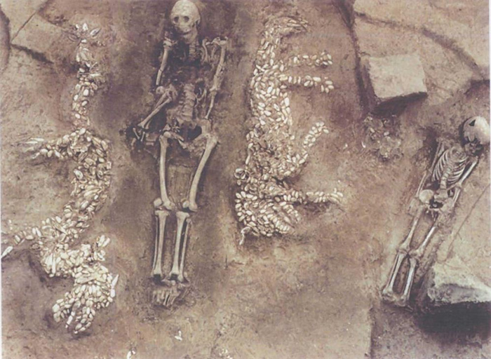 除了東北地區,在中原地區的史前時期也有令人稱奇的龍形圖案。在河南濮陽西水坡一處距今6400年的史前遺址中,考古工作者在第一組45號墓穴中,發現了古代先民用蚌殼精心擺塑的龍虎圖案:龍和虎分別位于墓室中部男性骨架的左右兩側。其中,龍圖案身長1.78米,昂首、弓身、長尾,前爪扒、后爪蹬,猶如飛龍在天一般,想象力十足。