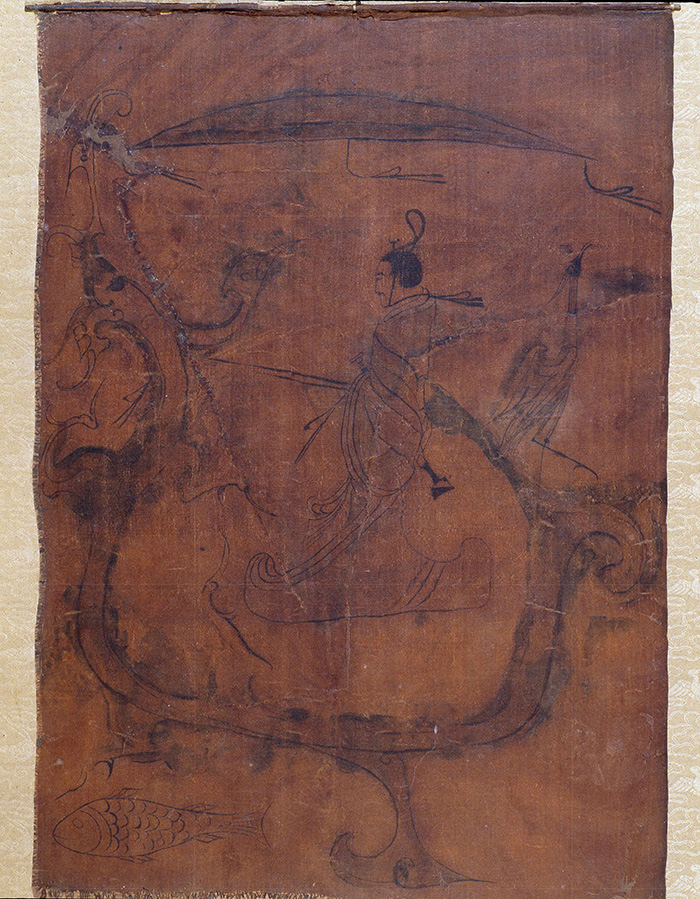 這件《帛畫人物御龍圖》出土于長沙子彈庫楚墓,畫面中心繪一有胡須的楚國貴族男子。他手執韁繩,駕馭著一條巨龍正向天國飛升。這幅帛畫反映出先民們對人死后靈魂不滅,乘龍天游或乘龍升天的一種愿望。龍昂首卷尾,弓身成舟,人物御龍乘風白鷺相隨,表現出男子軒昂自若的風度。此帛畫是喪葬中使用的“魂幡”。