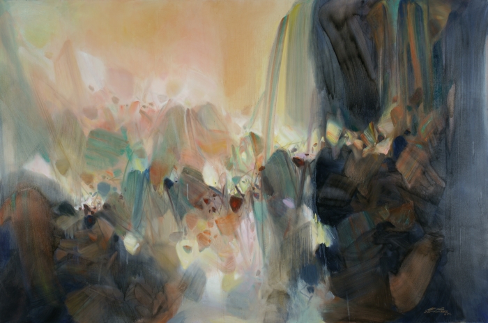 朱德群是行動抽象(gestural abstract)史上的重要代表人物。他的繪畫作品來自于與畫布表面的感性、未經預先考慮的對抗。星云和漩渦出現了,它們復雜的多色是由強大的明暗效果形成的,沒有求助于浮雕或厚涂,并系統地拒絕幾何形狀。他的空間,超出了畫布的尺度,是一個流動的矩陣,我們的視覺被投射和沉浸其中,導致我們失去所有的空間和語義參考點。