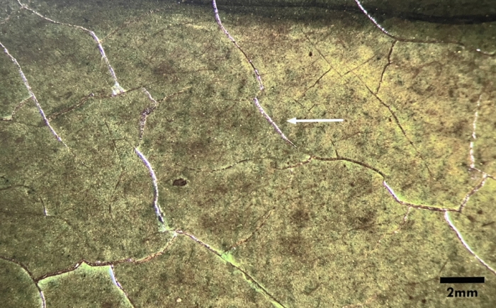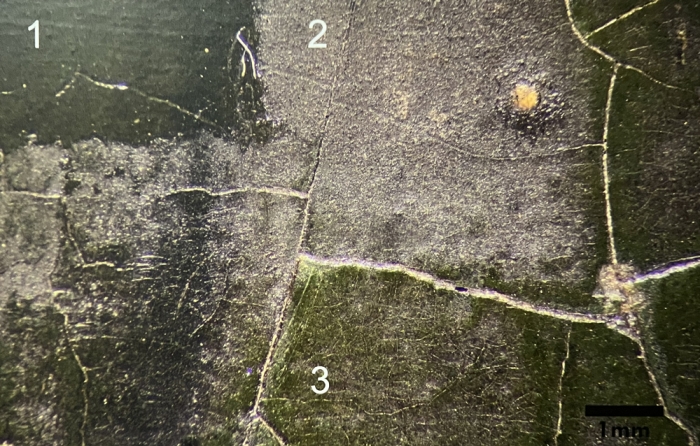 【區域1】未清理的老舊清漆層;【區域2】清漆去除后的草酸鹽層;【區域3】清除草酸鹽后,作品原有的綠色顏料層得以再現