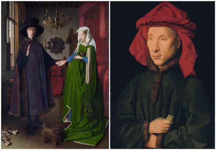 揚·凡·艾克,左圖*:《阿諾菲尼的婚禮》,1434,倫敦英國國家美術館藏;右圖:《紅帽男子肖像》(Portrait of a Man with a Red Chaperon),約1435-40,板面油畫