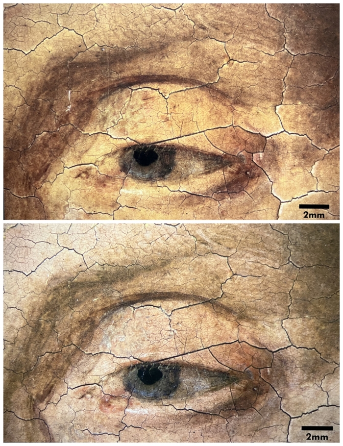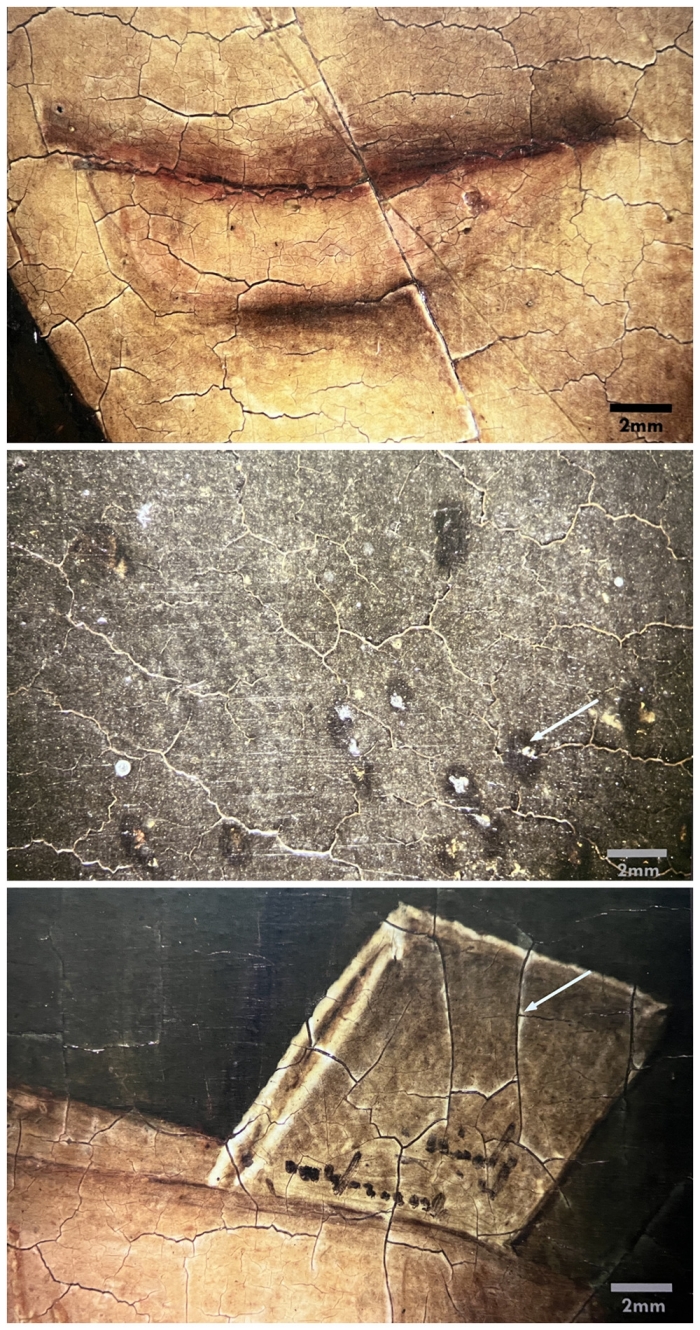 修護之前的《紅帽男子肖像》,上圖:肖像面部泛黃的清漆層;中圖:背景中的老舊潤飾;下圖:顏料層龜裂磨損