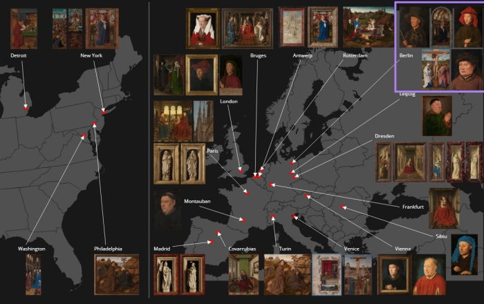 揚·凡·艾克現存藏品全球分布圖,紫色框內為本次特展主辦方柏林畫廊藏品數,圖片來自“Closer to Van Eyck”官方網站(KIK-IRPA)
