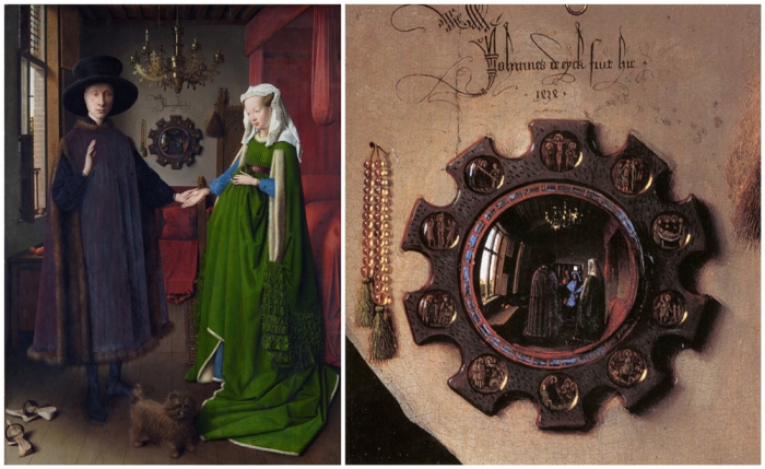 揚·凡·艾克(Jan Van Eyck,約1390/1400-1441),左圖*:《阿諾菲尼的婚禮》,1434,板面油畫,倫敦英國國家美術館藏;右圖*:《阿諾菲尼的婚禮》中揚·凡·艾克的簽名