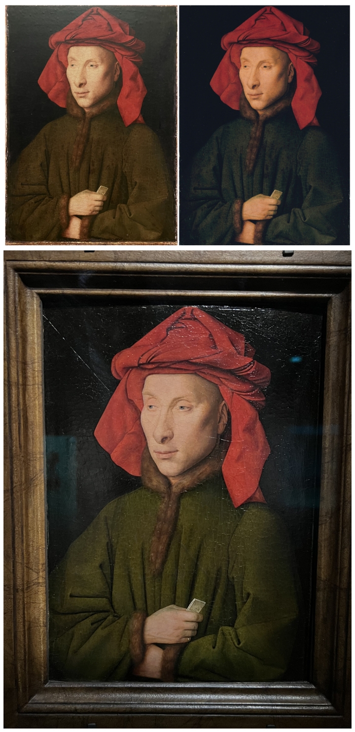 揚·凡·艾克,《紅帽男子肖像》(Portrait of a Man with a Red Chaperon),約1435/40,板面油畫,左上:修護前;右上:修護后官方圖;下圖:翻拍于“放大揚·凡·艾克:杰作中的細節”特展現場的原作