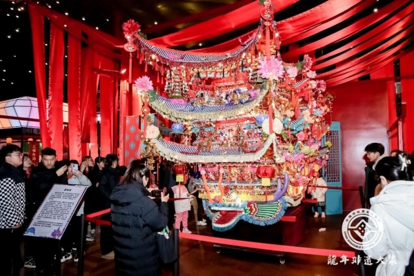 以來自重慶的國家級非遺項目——銅梁龍為例,歷史源遠流長,兼收南北龍舞之所長,舞時煙花燒龍、伴奏音樂獨特。一條巨龍在游、盤、翻、滾間,展現動中有韻、靜中有勢的龍韻。作為“巴渝十大民間藝術之首”,銅梁龍曾參加過北京奧運會、上海世博會等國內重大活動,多次受邀參加中外文化交流,龍年非遺大集期間,觀眾可在把式江湖區域有幸一睹“中華第一龍”的風采。再如千物集區域內展出的浙江樂清傳統美術燈彩——樂清首飾龍,制作工藝復雜,集木工、油彩、紙扎、龍燈等百工于一船,通過巧妙的機械傳動裝置使得船身200多個形態各異的人物栩栩如生,演繹80余個戲劇場景。本次展出的首飾龍由國家級代表性傳承人林如奎先生所制,曾榮獲中國民間文藝最高獎——山花獎,觀眾可近距離感受傳承百年的匠心技藝。