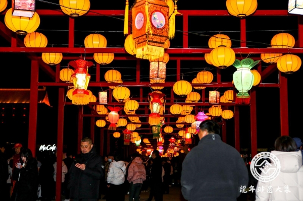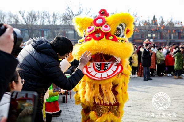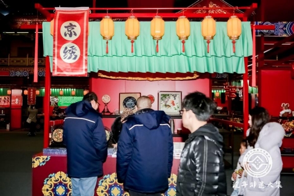 龍年非遺大集,精心設計搭建傳統坊巷街景,空間上分為“甲辰龍集”“把式江湖”“食神街”和“千物集”四大板塊,匯聚中國特色的非遺展演,五湖四海的非遺美食和傳統手工藝。其中,位于國安第一城中心廣場的甲辰龍集依照春節習俗,又細分為“鼓樂區”“送福區”“團圓區”和“繡紡”等,鼓樂區內以傳統吹打樂器為主,南北鼓樂迎新春,營造過年歡樂氛圍。送福區以“?!弊譃橹骶€,傳統剪紙、彩繪、書法等非遺項目傳承?現場展示,為觀眾送“?!?。團圓區、繡紡區和趕集區還原了“闔家團圓”“新年制新衣”和“春節廟會”的熱鬧場景,糖畫、面塑、古彩戲法、皮影等存于老一輩記憶中的民俗在大集現場原景重現,幫助觀眾找尋記憶中的“年味兒”。