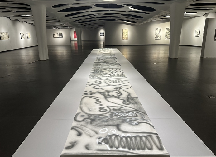 張子康:因為展廳里有一個不方便移動的長臺,我就思考如何把它利用起來。雖然之前沒做過涂鴉,但有水墨用線的經驗,涂鴉對我來說很容易??紤]不能破壞展臺,就噴繪在了一張紙上。其實這與我其它的繪畫創作差不多,不過是需要在短時間內創作一張畫,狀態更自由。在這個場域里,我自然會考慮與四周的繪畫作品的關聯。因為整個展場四周的作品是主體,比較實,我希望呈現一個實驗性的空間關聯,中間這張作品我就采取了虛的方式。虛實關系也是對中國文化里的一種理解和思考。