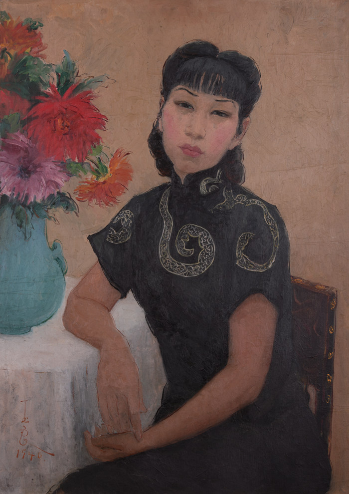 在她1940年創作的《自畫像》中,潘玉良身穿黑色旗袍靜靜地坐在一個繪有彩色的花朵的花瓶旁邊,在淺黃色的背景映襯下,端莊,安靜,散發出富有才華、帶有東方神秘意味的典雅氣息,這一形象符合大眾對于傳統東方女性的認知,此時潘玉良的自畫像表現的還是他人眼中的“潘玉良”。
