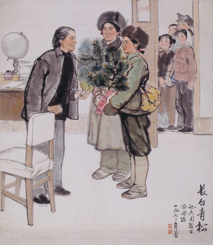 縱觀周思聰的藝術創作不難發現,她的藝術面貌在主題與風格上發生了很大的變化,其思想情感也在不斷變化。新中國成立后以重大事件為題材的現實主義創作,如《山區新路》《抗震小學》《長白青松》等,作品中都帶有女性獨特的視角,以1973年創作的《長白青松》為例,作品中表達了師生之間的深厚情誼與人道主義關懷。在規定特定主題的情況下,周思聰憑借自身豐富的生活體驗,從細膩的女性視角出發,關注人與人之間的情感聯系,表現紅色年代的人情、人性,這一角度使同時代的廣大觀眾與之產生共鳴。