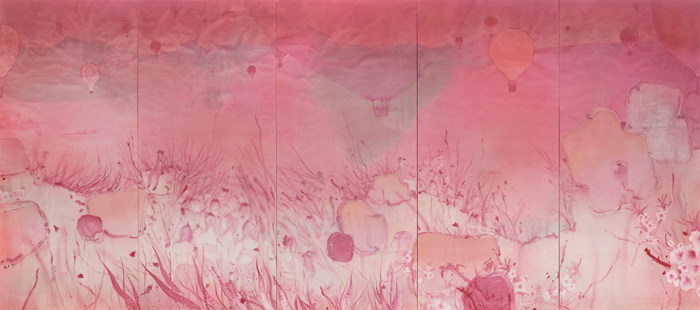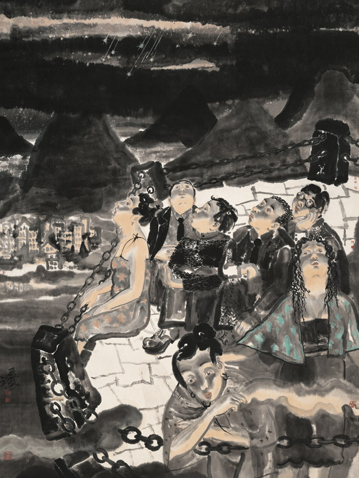 和中國傳統的詩歌中的情景不同,《赤霞》有著現實主義和象征主義的宏大情緒,但在光影的疊合和飄起的熱氣球中,它又多了幾分夢幻的色彩,像是電影,又像是舞臺。然而,畫中的人物卻總是迷茫的、不安的,他們的情感無可名狀的飄忽不定。5張巨幅水墨,在碩大的空間,像是一幕幕戲劇,它們在劉慶和筆下重申了繪畫觀照現實的獨特魅力,它既不是全然的寫實,也不是完全主觀的寫意,它是現實的虛像,時空的魔術,含混的感知,很多時候它比真實本身更接近于事物的感受。