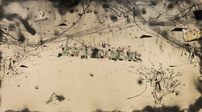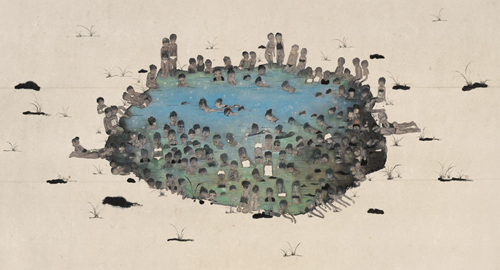 視角的改變,同樣帶來了感知的變遷。這些畫作,不同與傳統長卷中流動的閱讀感,它提供了一種接近于窺視的感受,仿佛站在高處透過密林看到的一片開敞的湖泊,讓故事多了一層遭遇感,時刻在發生變化。同樣,“留白”在這里變成故事邊緣的模糊,場景虛化的邊界,為觀看提供了一種阻隔的距離,觀者與畫中人仿佛處在兩個世界,一個闖入者的目光?;蛟S是因為俯視的視角,這些人物顯得更加渺小和壓迫,仿佛命運中的玩偶,人如螻蟻一般有著定數、無助的宿命感。