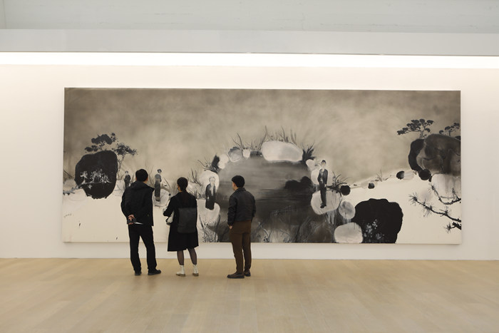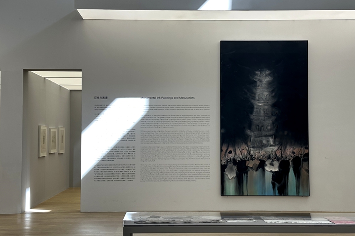 5張巨幅水墨匯集了劉慶和多年藝術觀念和語言探索的積累,它們環繞在展廳的四周。巨大的尺幅,接近于真實世界的體量,風景在這里轉化為壯闊的光影與氣象,畫中的氛圍以籠罩的方式帶動著觀眾的心理感受。然而,和傳統水墨的散點透視相比,它的視點又是單一的、現代的,故事一覽無遺,統一在一個視點之下。像是長篇小說中多種時空、人物和命運的疊合,多聲部在同一個空間中發生,成為劉慶和巨幅作品的顯著特征。