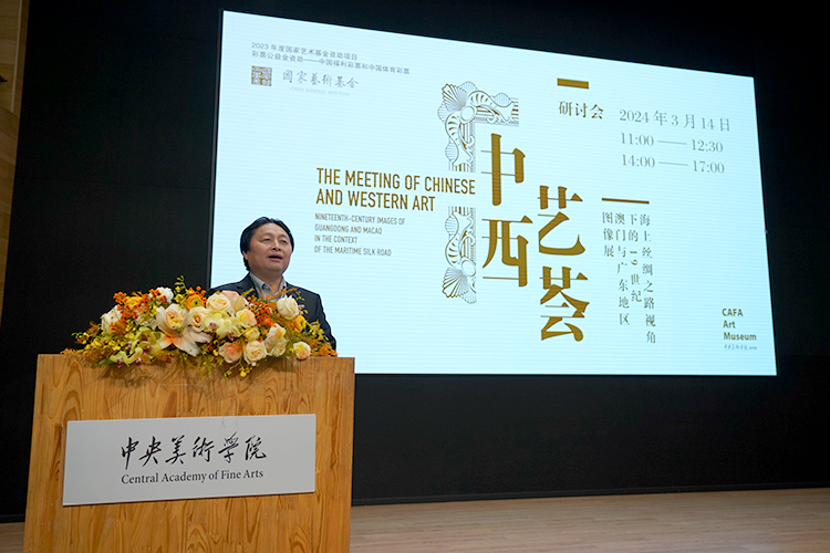 2024年3月14日上午10點,由國家藝術基金資助的“藝薈中西——海上絲綢之路視角下的19世紀澳門及廣東地區圖像展”開幕式在中央美術學院美術館開啟。出席本次展覽開幕式的嘉賓有:駐澳門特別行政區聯絡辦公室宣傳文化部文體處處長白冰,中國文化和旅游部港澳臺辦港澳處伍俊,中國文聯副主席、中國民間文藝家協會主席潘魯生,中央美術學院院長林茂,中央美術學院副院長邱志杰,澳門科技大學人文藝術學院院長張志慶,澳門科技大學人文藝術學院副教授汪藍,銀川當代美術館藝術總監呂澎,中央美術學院美術館館長靳軍、直屬黨支部書記韓文超等,以及眾多行業內專家、媒體記者、藝術從業人士等。中央美術學院美術館副館長高高擔任主持人。
