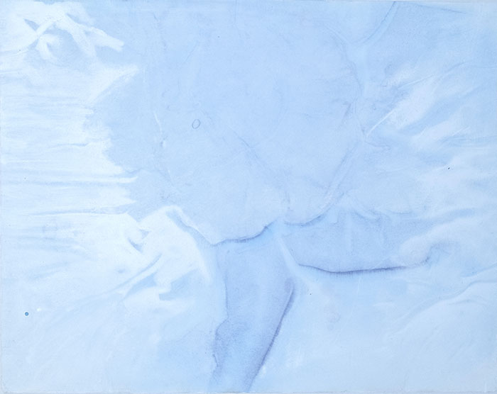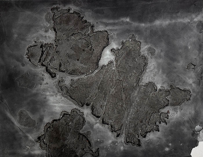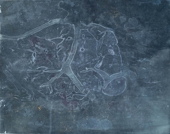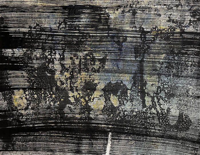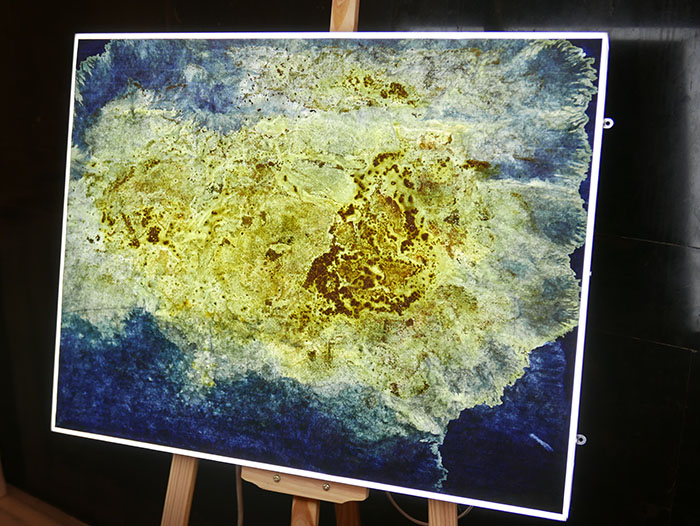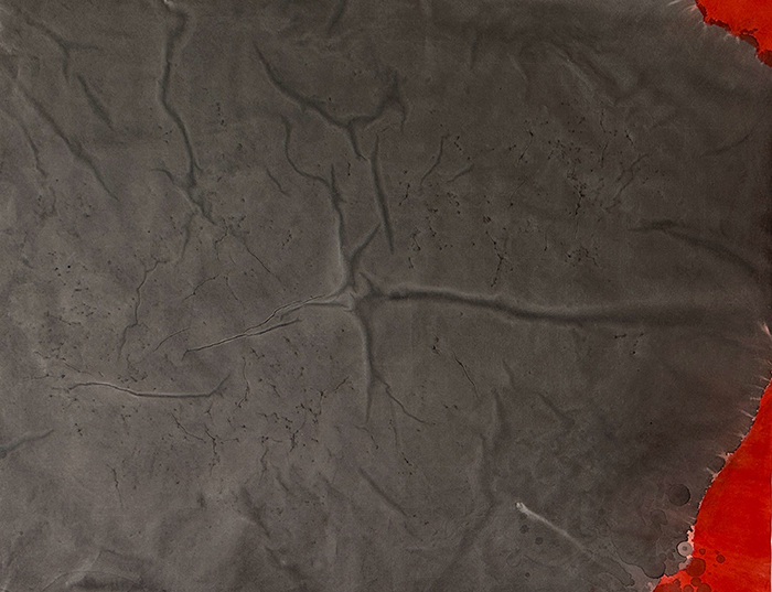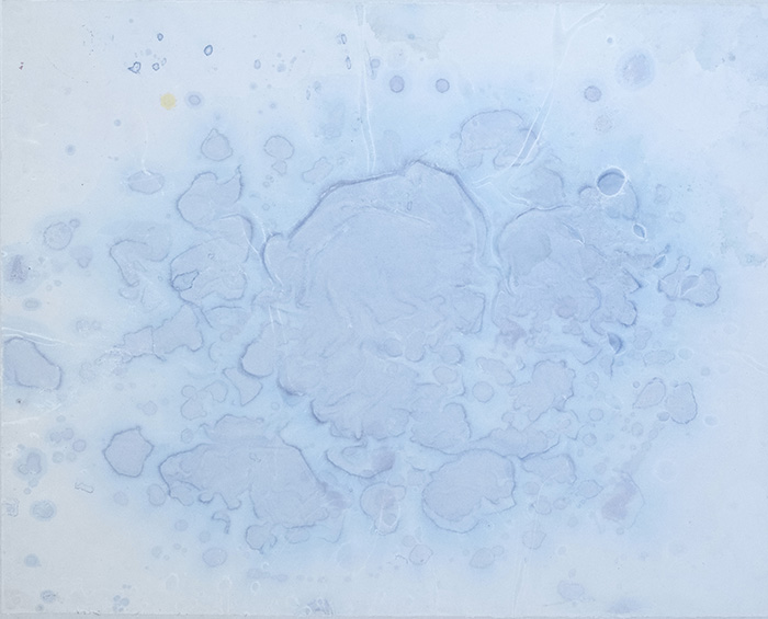 熵發生作用必然離不開時間。藝術家顏璐曾在生病期間創作過一組作品,二十多天里,她每天為畫作加上一層顏色再噴上一次水,紙面每一次被打濕,就會產生新的凹凸起伏,就像地殼相互擠壓形成山川,稀薄的顏料也會順著低洼處構建出漸變和形體。對于有些作品,藝術家已經記不清畫了多少層,這都需要漫長的時間滋養。而對于化石來說,時間要以上億年的尺度來衡量,藝術家也把作品用拓印的方法與這樣的時間相連接,作品也就仿佛有了上億年的記憶。