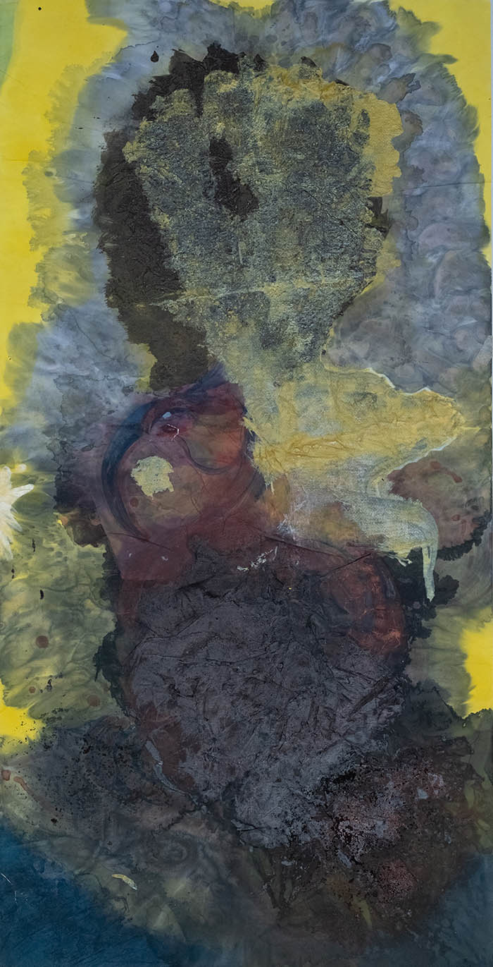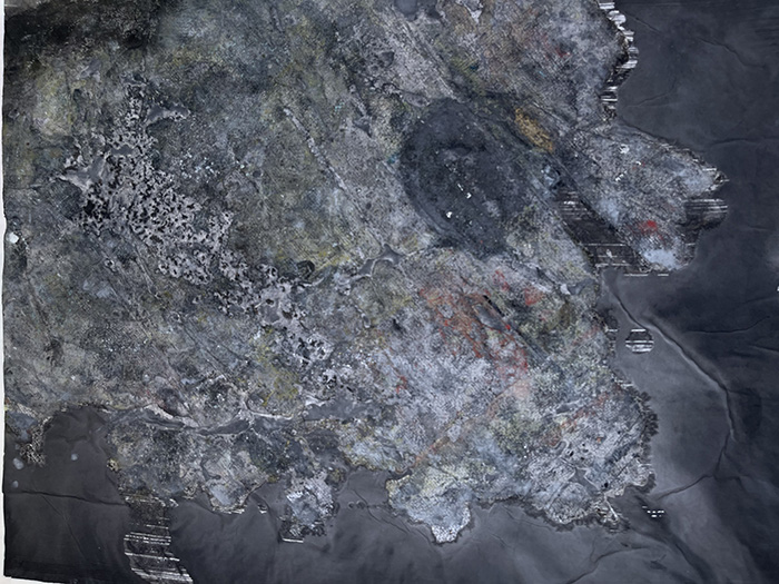 顏璐對遷徙的敏感,使她的作品有很強的在地性。在首爾,在柬埔寨,在曼谷、云南和湖南,當地的體驗給她強烈的震撼,促使她把感受和腳下的土地相結合。在作品中她把吳哥窟的殘缺雕像補全,把在云南高海拔山區中撿到的化石拓印在韓紙上。特別是在現代社會中,遷徙是一種常態,它產生了非連續性、疊加、混合但又保持距離的特殊狀態,異鄉人的體驗貫穿在生活中,催生了她作品中的豐富性——多層覆蓋,豐富的材料,甚至將色痕、草木灰等埋藏在層疊的顏料中。