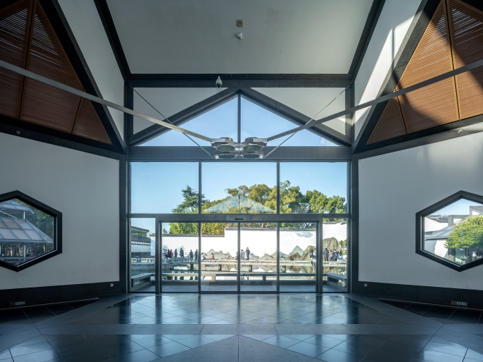 從蘇州博物館(2000–2006)大廳望向花園所見的主要景觀,包括亭子、石景和樹木,蘇州 2021 年