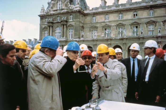 貝聿銘及法國總統弗朗索瓦·密特朗檢查羅浮宮金字塔的玻璃樣品 1987 年