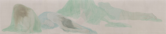 徐華翎的《見山》氤氳朦朧,用當代東方美學表達了對青春和時間等話題的探討。遠看是山水,近看,山峰之下其實是被覆蓋的女性身體。成為“風景”的女性,既揭示了一種被物化的關系,其實也可以感受到女性力量作為山川的緘默與偉大。纏繞著他們的是綠色紗網——這種材料經常用于覆蓋裸露的建筑工地,既出人意料,又令人揪心。