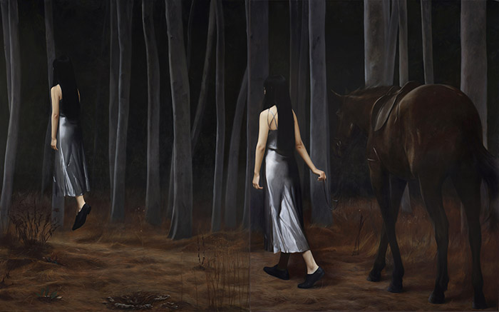 藝術家薛若哲的作品將《洛神賦》的故事與當下的社會議題和性別環境相連接,把“我”凝視洛神的二元對立關系表現為女神與自身的關系。這件作品是第一幕,女神牽著馬走進畫面,而另外一個她正在逃離畫面。繪畫自身的敘事遵循的是圖像的邏輯,它與語言邏輯不同。作品中運用了視錯覺來使觀眾從寫實的視覺中抽離。他在采訪中表示,繪畫在當下依然有很多的可能性,但沒有被我們充分討論過,他愿在這個古老的媒介中深耕?!爱斚潞芏嗬L畫已經圖像化了,繪畫是圖像但絕不僅僅是圖像”。