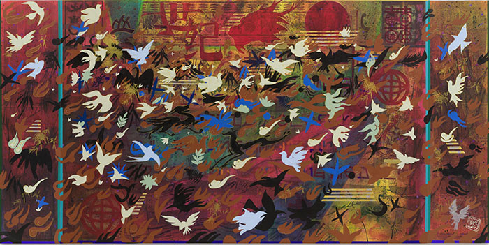 蒲英瑋,《世紀》,2023—2024年,布面油畫、丙烯、紙本拼貼、絹、絲網印刷、金箔、馬克筆、噴漆,200×400 cm