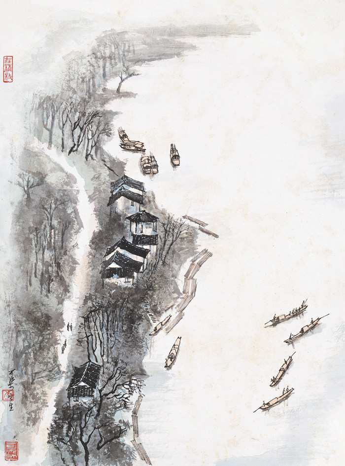 李可染與張仃、羅銘結伴,三個月中途徑無錫、太湖、蘇州、上海、杭州、富春江和黃山。他們一路住馬車店,吃路邊攤,100元花了幾個月,飽覽江南風景,寫生收獲頗豐。面對靈秀又詩情畫意的江南煙雨,李可染以中國畫的筆墨還原視覺的真實。他留意寫生時所見到的一切,并嘗試用新的形式語言表現其靜觀自然收獲到的一份天趣?!队暌嗥妗?、《家家都在畫屏中》等作品中技法上的多樣性和豐富性令人耳目一新。