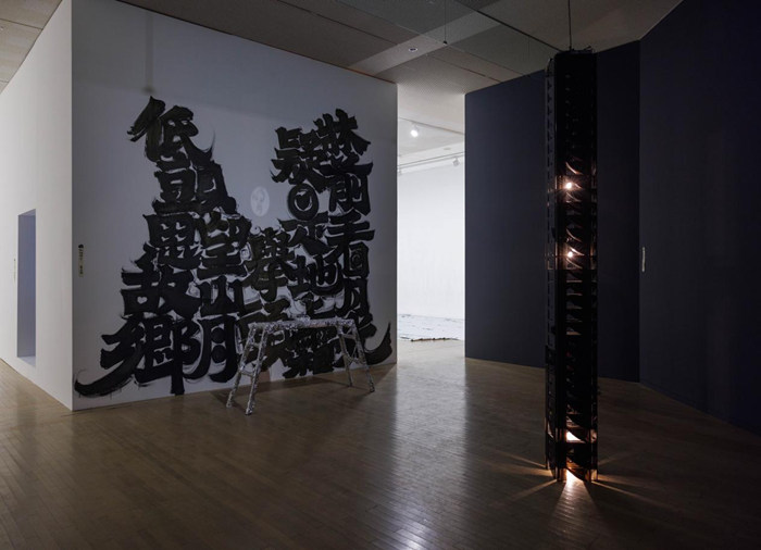 魯大東在展覽現場題壁書寫李白的經典唐詩《靜夜思》的日文版本。唐詩的意義隨著歷史上中日兩國間文化交流的相互影響和傳播而發生轉譯,中文所熟知的“舉頭望明月”來源于明代的改動,而日文中的“舉頭望山月”則更接近于李白當初的版本。魯大東巧妙地通過文字、鏡子和燈光補全在日文詩中缺席的“明月”,趣題《何時明月》,并利用展廳中的現成物腳手架制作唐代憑幾,營造出夜晚他鄉異客的望月情境。該詩與展廳另一端宇野雪村的唐詩作品《白日依山》也構成了日月與晝夜呼應,分別抵達外觀與內省的兩種心境。