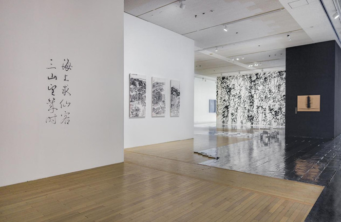 出現在展廳中央的是墻面巨幅書法《寒山子詩亂書》,由藝術家王冬齡為本次展覽特別創作。寒山子常年隱居于天臺寒巖洞,其詩集的注本、譯本于日本問世后,對海外禪宗產生了深厚影響,他的形象也走入了畫史和神壇。王冬齡以亂書形式重訪寒山子詩文,既神通詩人“此時迷徑處,形問影何從”的隱逸,也演繹了其“四顧晴空里,白云同鶴飛”的灑脫。結尾處“今日揚塵處,昔時為大?!币痪?,回應了“山海渡遠”中歷代文人的時空會際與思想交流,傳達出滄海桑田、古今共時的感嘆。
