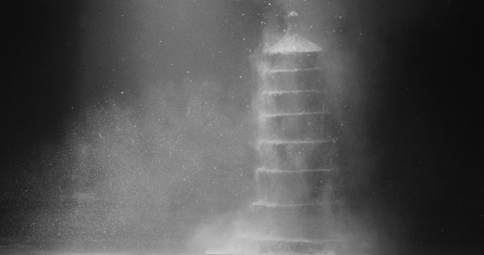 管懷賓的作品《流隙》則記錄了佛塔沉水消散之象。流隙是物質的侵蝕和流變,是歲月對于歷史與記憶的打磨過濾,也是無數的精彩時刻被擠壓消耗的瞬間。作品記錄了一座由陶土砂漿鑄造的塔在水下不斷侵蝕坍塌的過程,猶如一幕凝固的歷史舞臺。而一旁梁琛的《無止境塔》則提供了另一種關于塔的想象,簡煉的機械燈光裝置構筑成永動的建筑,如同不斷旋轉上升的巴別塔,直指穹宇。塔內的樓梯在光線中投射于展廳,環抱“仙山”,在照亮一方洞天的同時,指向關乎人類不斷向上攀登向外探索的精神追求和洞穴現實的永恒隱喻。這兩件作品以不同的媒介觀照作為人類精神寄所之塔的兩種時代形態,思考在快速發展的文明進程中的歷史與文化記憶的所失所得。