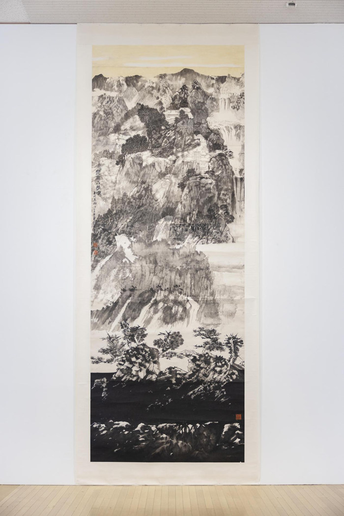 峰回路轉處,卓鶴君的水墨作品《泉高入夢喧》矗于“仙山”,其高丈二,頂天立地,畫面中山峰層疊,云霧環繞,寺廟高懸其間,泉水奔瀉而下,聲勢浩大。山腳之下,樹木山石剛韌有力?!吧缴咸鞂⒔?,人間路漸遙”,尋仙問道、參禪禮佛,山水之路固然縱情恣意,亦縹緲夢幻,詩畫所托之情皆寓于其中。