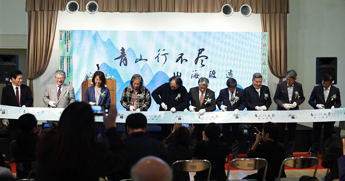 中華人民共和國駐大阪總領事館總領事薛劍,中國美術學院院長高世名,中國國際貿易促進委員會駐日本代表處首席代表史銘,中國貿促會駐日本代表處首席代表、大阪經濟戰略局都市間交流擔當課長藤田裕美子,東京藝術大學榮譽教授坂口寬敏,中方藝術家代表王冬齡,日方藝術家代表向井修二,和歌山縣日中友好協會會長中拓哉,西日本中國企業聯合會會長關志浩,大阪華僑總會會長趙知理共同為“青山行不盡:山海渡遠”唐詩之路藝術展剪彩啟幕。高世名、薛劍、中國建筑科學院建筑設計院總建筑師、2025年大阪世博會中國館總咨詢師朱寧濤先后致辭,2025年度日本大阪世博協會石毛博行總長賀電,坂口寬敏、王冬齡、史銘分別講話。開幕式由展覽聯合策展人、中國美術學院科研創作處副處長谷叢主持。