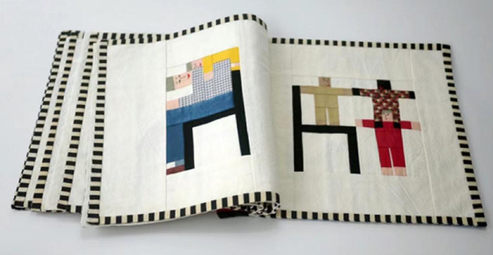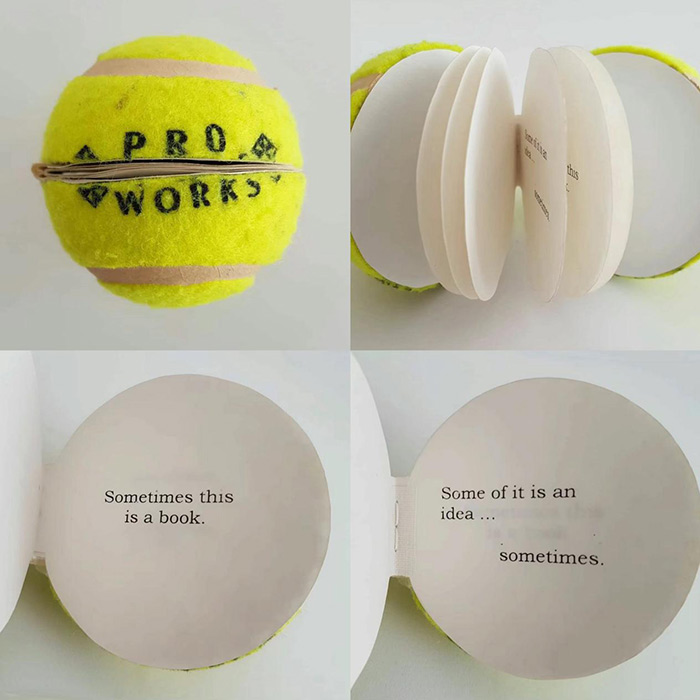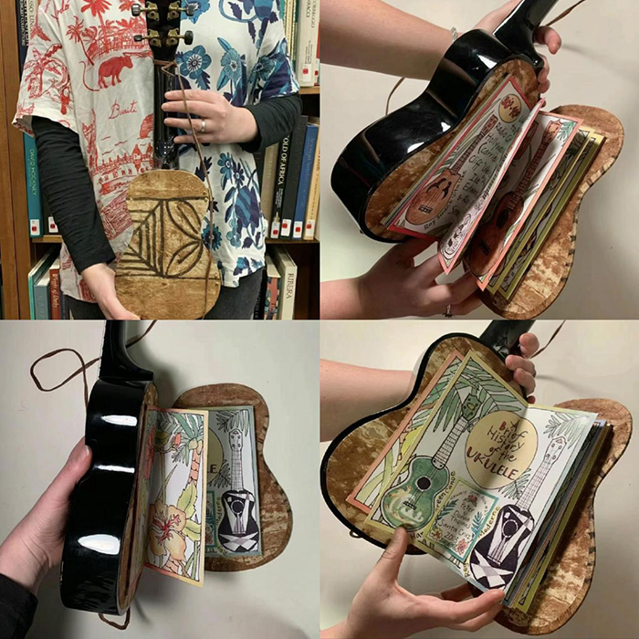 藝術家Peter和Donna Thomas的《尤克里里簡史》(A Brief History of Ukulele)的制作方法非常特別,是將一把尤克里里鋸成兩半,空間內放著風琴折頁的插畫書,兩側分別貼在琴的內板上。當四弦琴被打開,尤克里里的簡史將隨著折頁的展開而躍然眼前。書封的材料和書的內容就這樣完美融合。