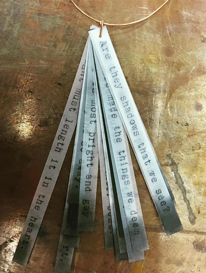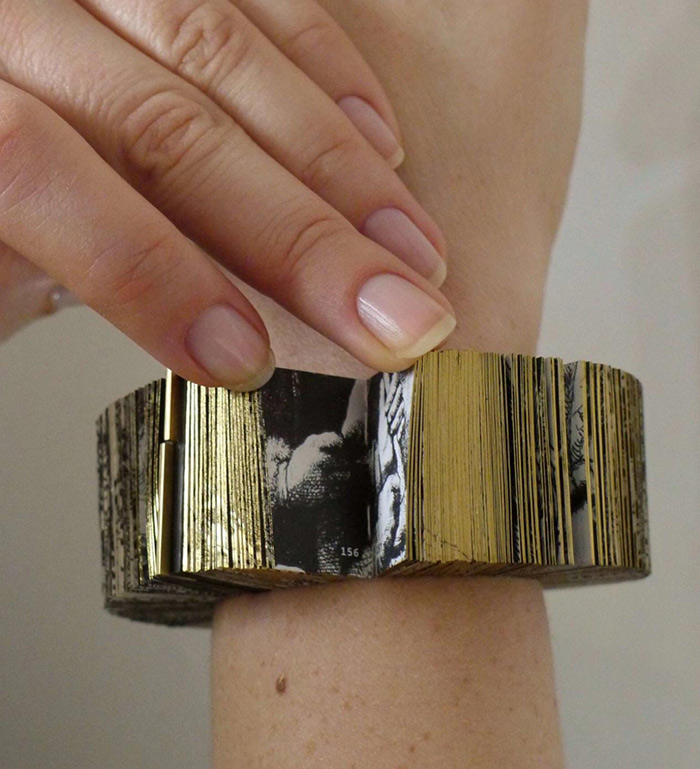 藝術家Sarah Maker創作了由一首詩構成的項鏈書,內容來自英國詩人塞繆爾.丹尼爾的《他們是陰影嗎》。詩句在佩戴者的脖頸之上跳躍著,人的身體成為了書的一部分。文字的流動裝點了平凡人生,美在此處有了更深邃的外延。