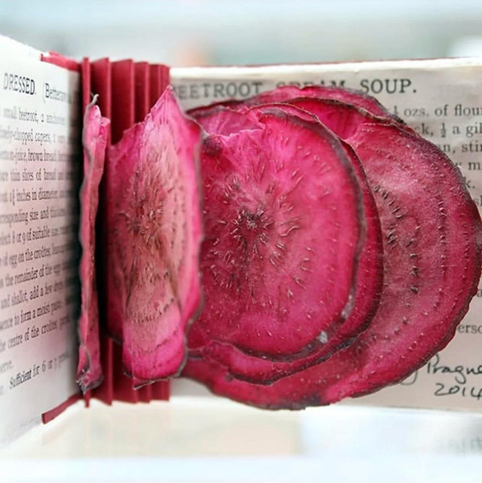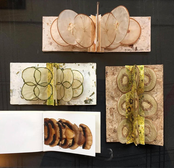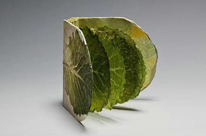 藝術家Dizzy Pragnell采用了古埃及人發明的莎草紙制作法,將水果和蔬菜切割成薄片,然后加工成紙張。這些日常食材被轉變成了精美的紙頁,最終被巧妙地編排,組成了一本本獨特的小冊子。通過他的手工書創作,重新定義了植物標本與紙質藝術的邊界。Dizzy Pragnell的創作是觀念上的革命,鼓勵我們以全新的視野去審視那些看似平常卻蘊含無限可能的事物。