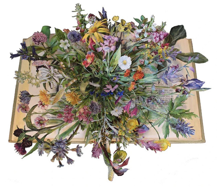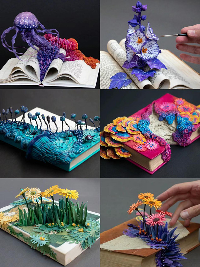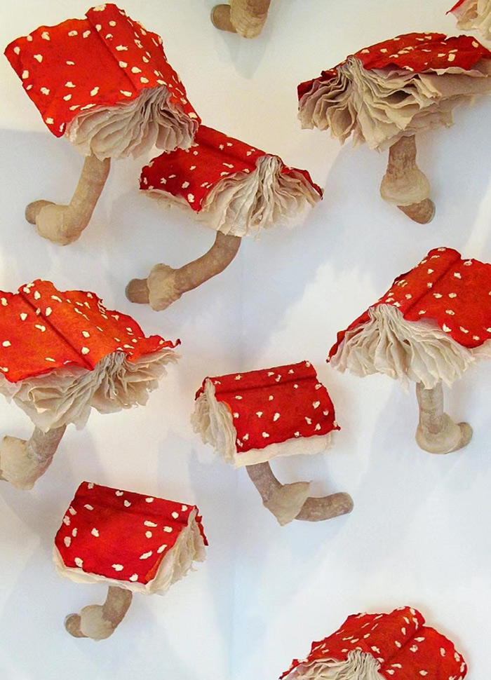 一些手工書藝術家會選用可回收或天然材料,減少對環境的影響,喚醒人們對環保議題的關注。芝加哥藝術家Melissa Jay Craig以99本書制成毒蘑菇的樣貌,組成大型真菌群的裝置,成為一系列可以閱讀的蘑菇。藝術家說:“當我還是個孩子的時候,我第一次有了'這如此有趣'的感覺,那是在我看到一群毒蠅傘菌時,它們擠在高高的松樹下一個黑暗而秘密的空間里。世界似乎通過這些美麗生物攜帶上一種神秘的文本?!?/p>