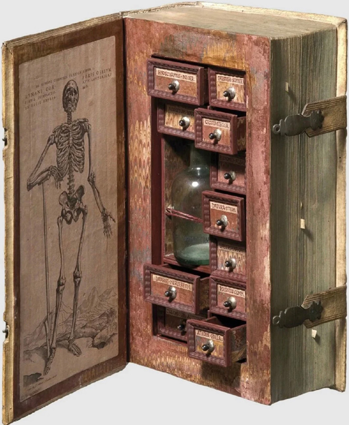 手工書的藝術性和獨特性使其具有較高的收藏價值,成為了許多收藏家和藝術愛好者的選擇。徳國赫爾曼歷史拍賣行(Hermann Historica)在2008年以8000美金的價格拍賣了一本奇怪的空心書,制作時間大約在17世紀,內部由尺寸不一的11個抽屜組成,抽屜上用德語標注著草藥或毒藥的名稱。書封面的內側,畫著骷媵人的死亡警告,引用了拉丁語版《圣經》中的一句話:"Statutum est hominibus semelmori",意為“凡人皆有一死”。