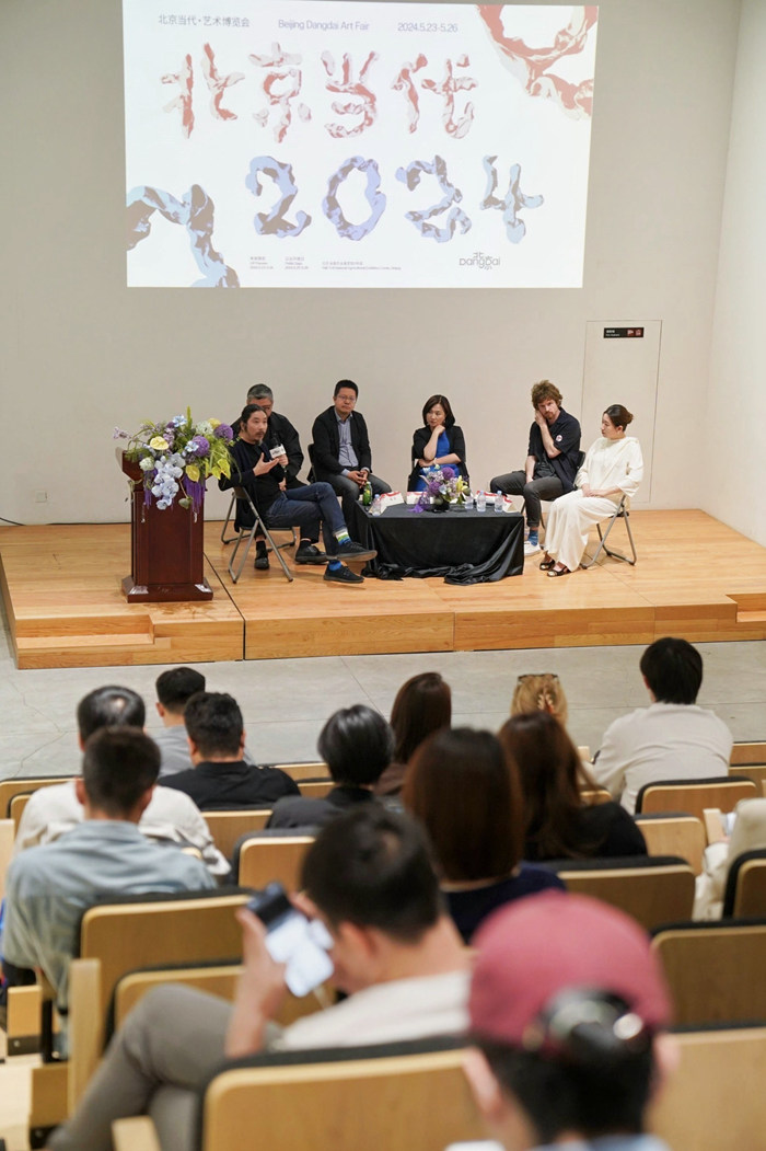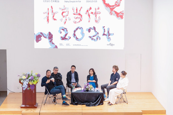 北京當代藝博會2024發布會圓桌討論 左起:北京當代藝術博覽會藝術總監鮑棟,收藏家田軍,北京國際設計周有限公司董事長王昱東,時代美術館執行副館長(北京館 成都館 重慶館)劉威威,麥勒畫廊創始人Rene? Meile,畫廊周北京項目總監楊佳霖