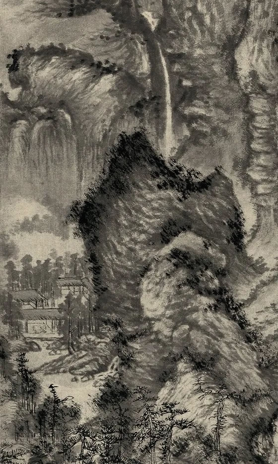 解索皴和牛毛皴對于表現南方山體植被繁茂、層次豐富的視覺觀感具有很強的表現力。王蒙所塑造的奇峰疊障,從山頭山脊、溝壑陰陽處,以各種皴法順勢而下,如編制細密的巨網,將山體的起伏、厚重和光線的變幻表現的淋漓盡致。