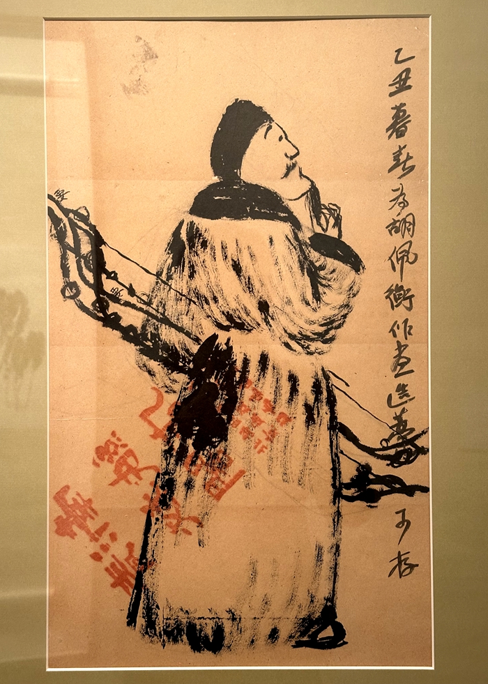 乙丑(1925年)暮春,齊白石曾為胡佩衡作畫造像,在此次展出的圖稿中,胡佩衡側身手抱長弓,捻須遠望。圖中畫了兩只弓,相距甚微,上方者標注了“要”??梢姲资先擞X得此弓往上提一點,更能顯示出“西北望,射天狼”的氣魄。展覽現場這樣的作品還有很多,表現出齊白石對自己作品的苛刻要求,精益求精,于細微之處見真章。