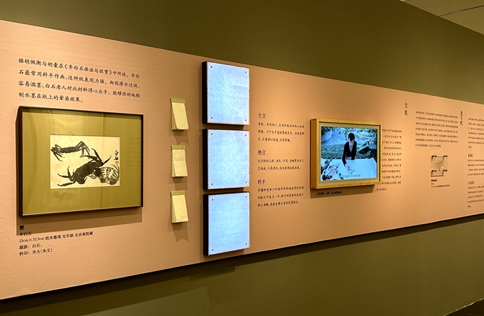 展覽特別呈現了對絹、生宣、熟宣、料半等幾種紙的說明,觀眾可以仔細觀看其紋理、脈絡,甚至用手觸摸其質感。展覽特別請北京畫院畫家范琛以墨試紙,以視頻形式記錄,直觀地呈現出不同紙的特性。白石老人作畫最喜料半,料半因造紙原料中青檀樹皮和沙田稻草配比各占一半而得名,它對筆痕的表現不那么清晰,更能發揮生宣的筆墨特點。