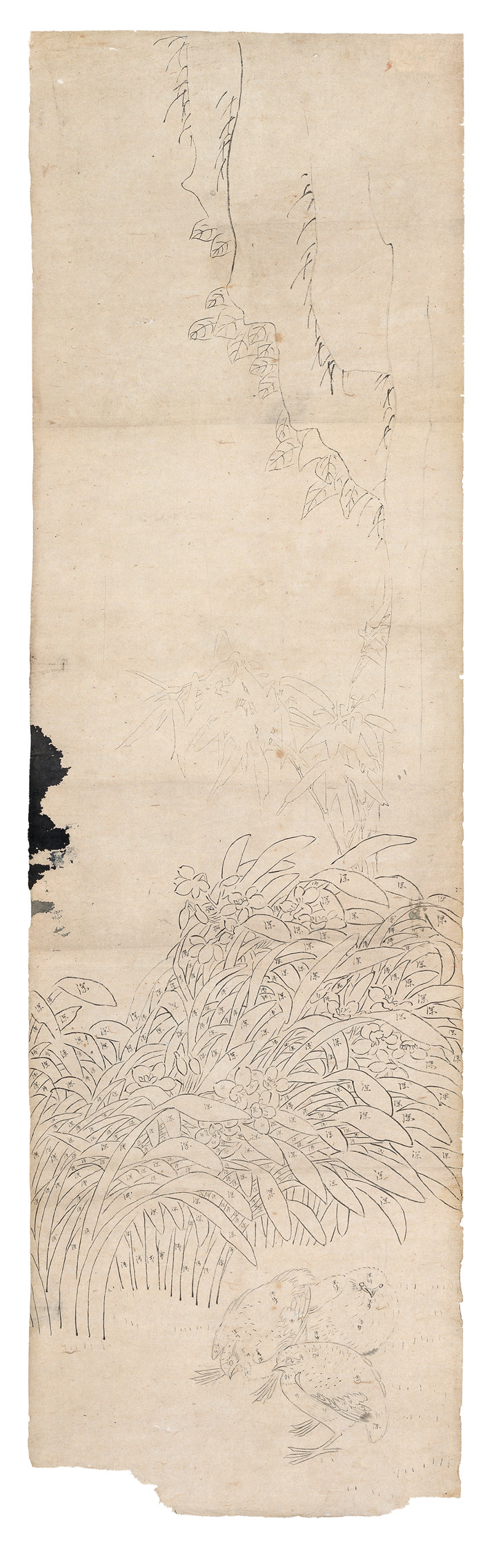 水仙鵪鶉稿 齊白石 紙本墨筆 144cm×43cm 無年款 托片 北京畫院藏