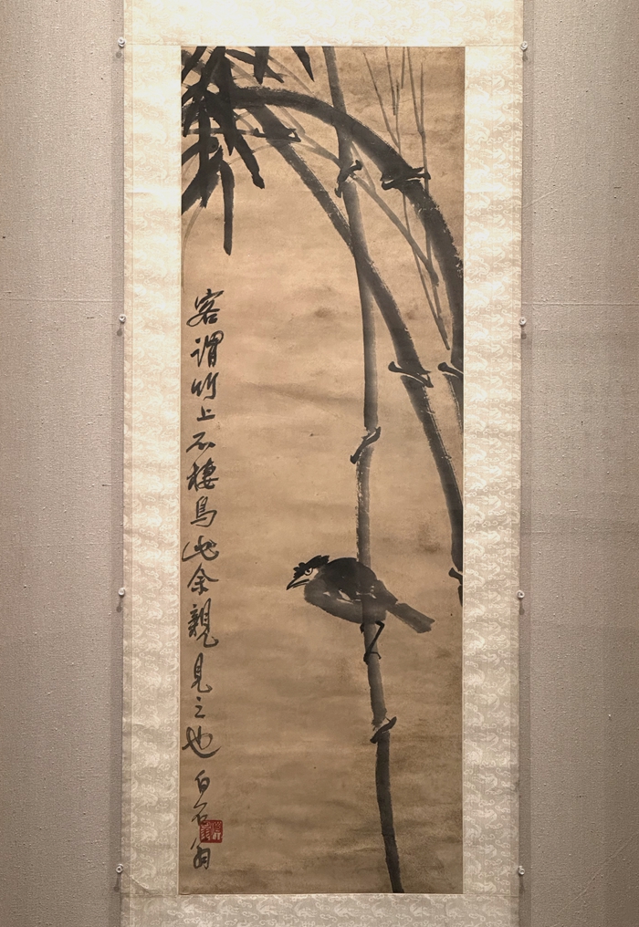 展覽的“隨手記錄”部分頗為有趣,是白石老人一些日常生活思考的隨筆,而其中卻包含著他作畫中難以窺見的一些細節。一張《竹鳥》立軸掛在該板塊首位,一只鳥停留在竹干上短暫休息,活靈活現,其上題跋“客謂竹上不棲鳥,此宇親見之也”,意思是今天有客人來說鳥從來不棲息在竹子上,但我確實親眼見過,不信?你看,我把它畫出來了。這幅畫不僅妥妥映射出一個的耿直且倔強的老boy的形象,同時也顯示出白石老人對生活日常觀察之細、記憶之深。