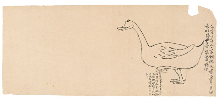 題款:余嘗于友人家(見)銅鴨香爐,通身有神味,非流俗畫家畫鴨也。此足踵。此長者,中爪,中爪上短者,傍爪。足欲蹈未蹈時,兩傍之爪向上反,故傍爪在上,中爪在下。