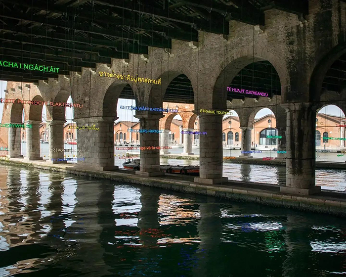 展覽開幕后,貼有威尼斯雙年展展覽海報的一艘艘客船載滿世界各地匯集于此的觀眾前往綠城花園和軍械庫,擁擠的人潮像是呼應此屆雙年展的主題——“無處不在的外人”。本屆威尼斯雙年展由阿德里亞諾·佩德羅薩(Adriano Pedrosa)策展,展覽的主題來自意大利巴勒莫的藝術團體克萊爾·方丹(Claire Fontaine)于2004年創作的霓虹燈系列作品,他們化用2000年初都靈一個反對種族主義集體的名字。不同語言的霓虹燈呈現“無處不在的外人”,作品懸掛于威尼斯軍械庫入口處的水面上,它們宣告著這屆雙年展的命題。