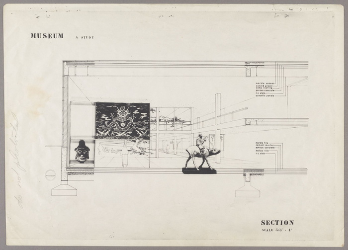 貝聿銘 哈佛大學建筑碩士論文中“上海中華藝術博物館”設計的剖面繪圖